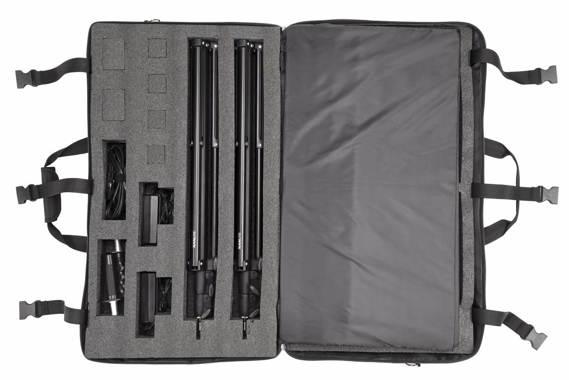 Nanlite LUMIPAD 25 LED kitti on suunniteltu paljon liikkuville kuvaajille, siksi paneelit toimivat sekä virtakaapelilla ja tarvittaessa myös erikseen myytävillä Sonyn NP-F sarjan akuilla. Setti tulee valmiissa säilytyslaukussa, jossa on hyvin suojatut paikat jokaiselle osalle jalustat mukaanlukien. Näin ollen aikaa säästyy pakkailulta, eikä tarvitse huolehtia laitteiden vahingoittumisesta.
