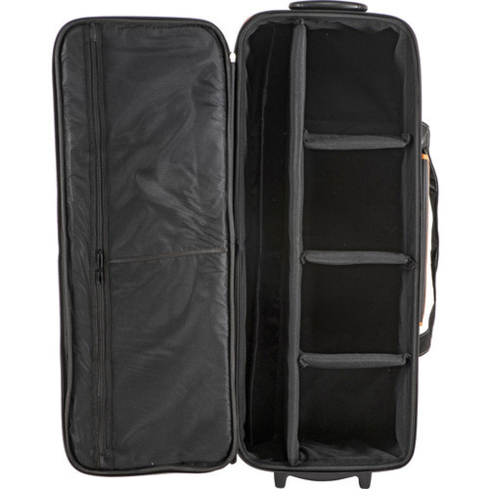Sisällä on tilaa esim. neljälle isolle studiosalamalle + tarvikkeille. Väliseinät ovat irrotettavat ja siirrettävät, joten laukkua voidaan muokata omiin tarpeisiin sopivaksi. Sisällä myös kaksi kiinnitysremmiä ja läpässä kaksi vetoketjutaskua. Laukku kulkee kevyesti kumisilla pyörillä.