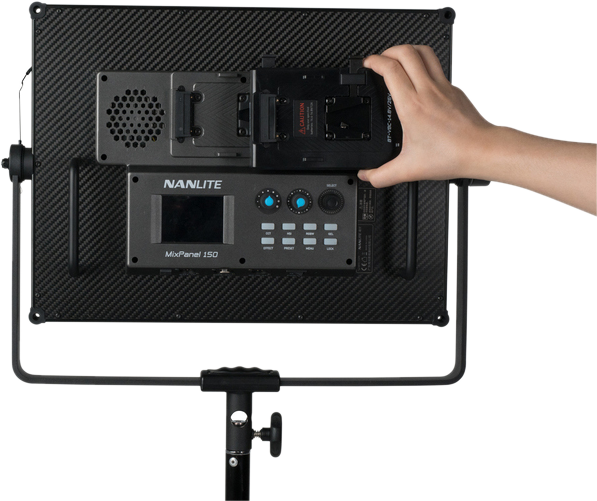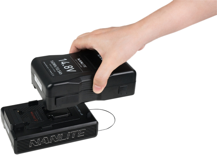 BT-VBC-14.8V / 26V V-Mount akkuadapterilla voi muuntaa 14.4V-14.8V/12A akkuja 26 volttisiksi. Voit antaa virtaa kalustolle 26V 150W (tai alle) tulojännitteellä.