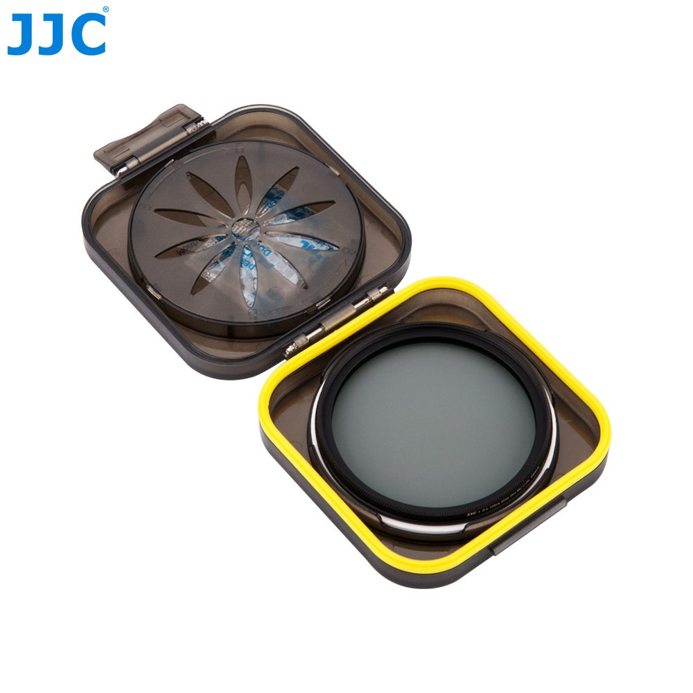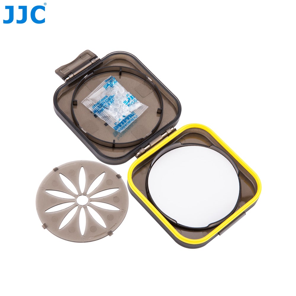 JJC:n simppelissä mutta toisaalta suorastaan nerokkaassa filtterikotelossa mukana 10kpl silica-geelipusseja, joita saa kotelon kannen sisäpuolella olevan ritilän alle imemään kaiken kosteuden pois kotelon sisältä. Pohjapuolelle mukana tulee niin ikään kosteutta imeviä pehmusteläpysköjä. Kannen reunoissa oleva kuminen tiiviste pitää kotelon myös suojalta enimmiltä vesiroiskeilta, mutta täydellistä vesitiiviyttä valmistaja ei kuitenkaan lupaa. Älä siis upota tätä veteen!