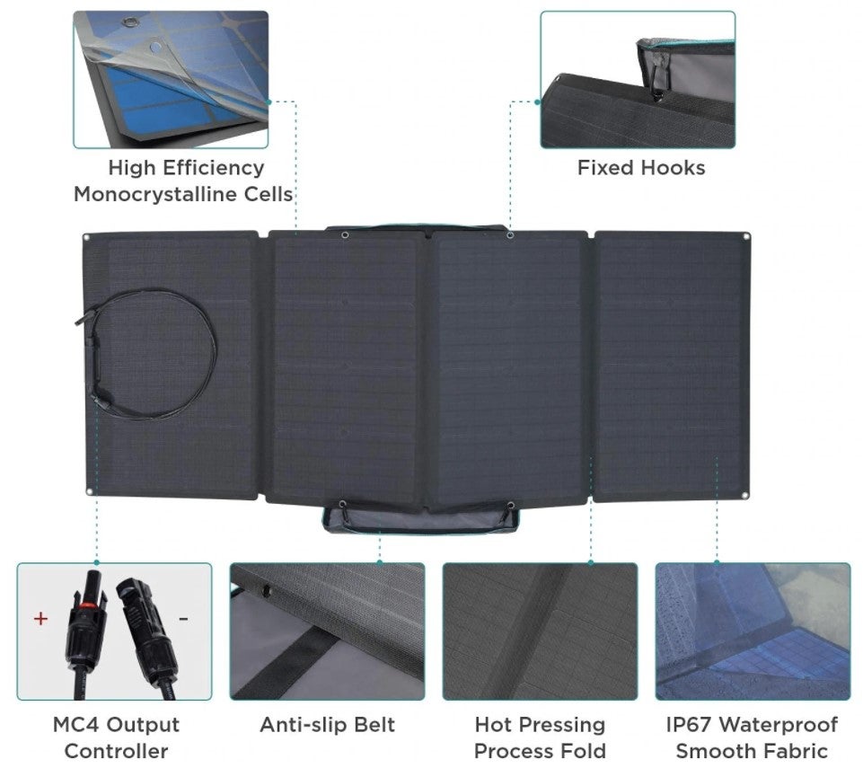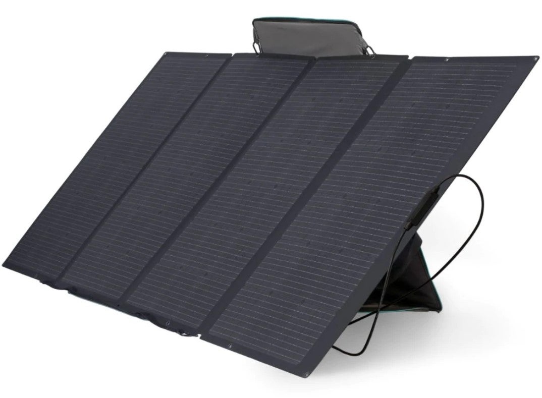 EcoFlow 400W Solar Panel eli kannettava aurinkopaneeli erityisesti MC4 ja XT60 liitäntää käyttävien akkujen lataamiseen. Tämä on siis yhteensopiva kaikkien Ecoflow-virtalähteiden kanssa. Paneeleita on mahdollista ketjuttaa. Isommat laitteet kuten Ecoflow Delta -sarja tukevat max kahta näin isoa paneelia ja pienempi River-sarja yhtä. HUOM varmista aina, että liitettävä laite voi ottaa vastaan 400W tehoa. Esim uusin Ecoflow Delta MAX ja delta Pro tukevat XT60 liitännän kautta 800W tehoa, joten näitä voi olla ketjutettuna 2 kpl.