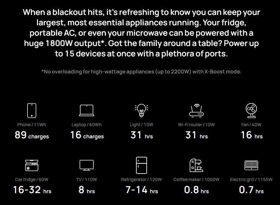 Delta 2 on lähes äänetön. Tuuletin on päällä vain teholatauksen aikana tai jos laitteesta otetaan ulos erittäin paljon virtaa pitempiä aikoja. Sisäkäytössä laite on tietenkin myös päästötön. Delta 2 voi syöttää virtaa samanaikaisesti jopa 13 laitteelle. Jatkuvaa kuormaa laite kestää 1800 W (X-boost tilassa 2200 W) ja hetkellisesti jopa 2700 W. Iso hetkellinen syöttöteho mahdollistaa verkkovirran myös raskaille sähkölaitteille ja työkaluille. Patentoitu X-Stream-lataustekniikka 230 V:n verkkovirrasta mahdollistaa jopa yli 1000W latausvirran eli laite lataantuu nollasta 80% varaukseen noin tunnissa ja nollasta täyteen kestää noin puolitoista tuntia. Laitteen lataamiseen ei tarvita erillistä laturia vaan pelkkä virtakaapeli riittää.