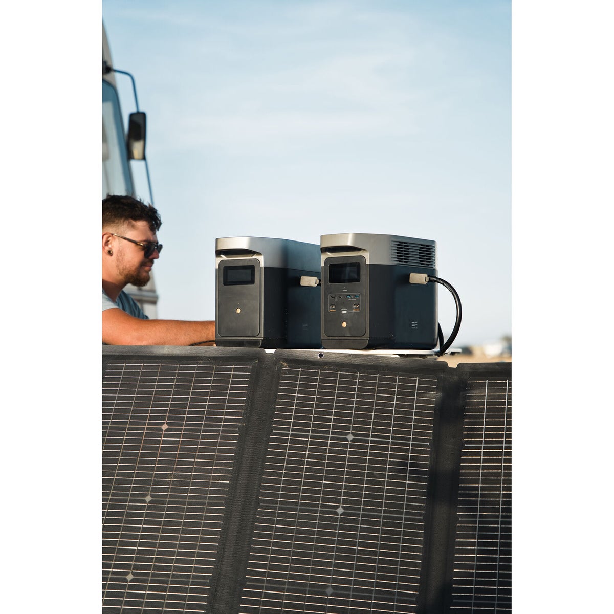 - Liitä virta-asemaan aurinkopaneeleihin, max 500 W (esim. 1 x 400 W tai 4 x 110 W paneeli ketjutettuna)