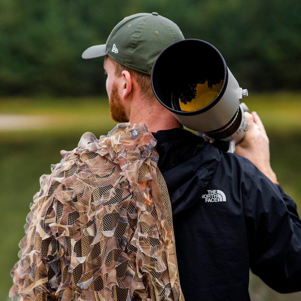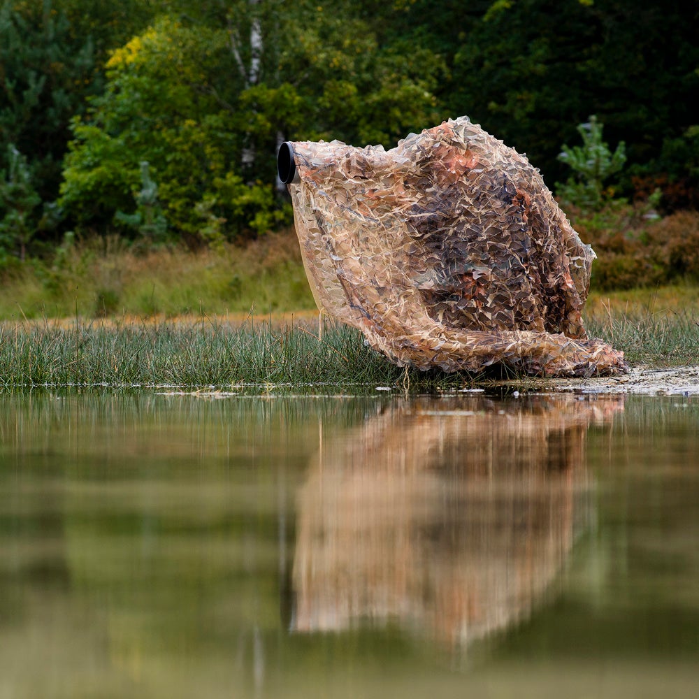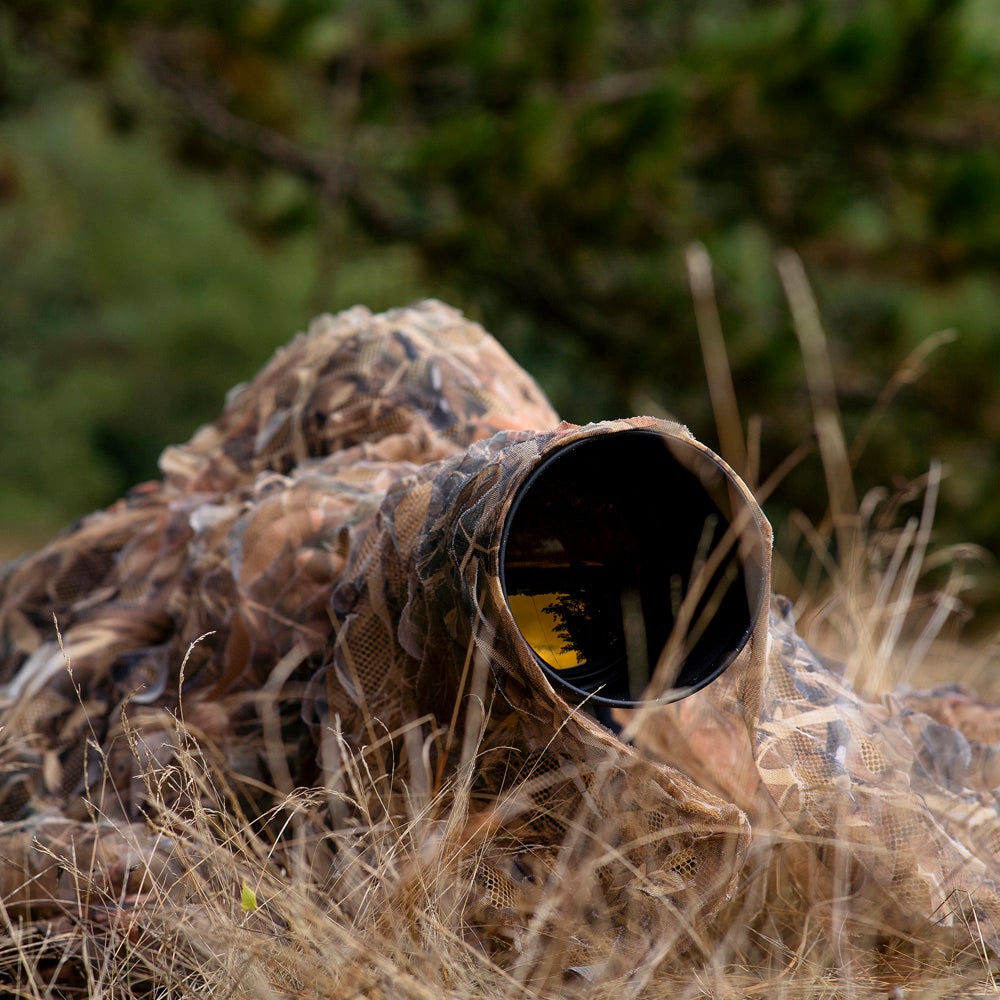 Kaislikkokuvioisella mesh-kankaasta valmistetulla camoverkolla piiloudut kätevästi maastoon, jotta vaikkapa lintujen kuvaaminen on astetta helpompaa. Verkko ei estä kameran käyttöä.