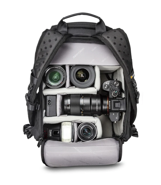 Vanguard Veo Select 37BRM on näppärä reppu kevyelle kalustolle, jonka kameraosastoon mahtuu kamerarunko ja jopa kolme objektiivia. Kameraosaston lisäksi repussa on lukuisia pikkutaskuja ja erillinen osasto 9,7" tabletille.