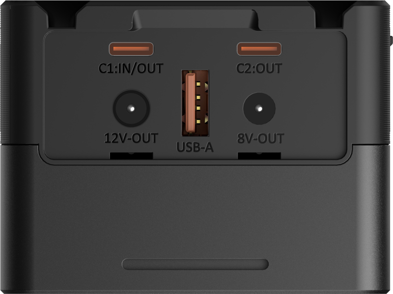Nimellisteho - 100W V Mount / D-TAP-tulo - 8A (Max) V Mount / D-TAP-lähtö - 14,8V / 14A (Max) USB-A-lähtö QC2.0/3.0 - 5V / 3A, 9V / 3A, 12V / 2.5A (Max.)) USB-C1 tulo/lähtö - Max. tulo/lähtö 100W. 5V/3A, 9V/3A, 12V/3A, 15V/3A, 20V/5A (Max.) USB-C2 Lähtö - Max lähtö 100W. 5V/3A, 9V/3A, 12V/3A, 15V/3A, 20V/5A (Max.) DC1-lähtö - 8V / 3A (Max) DC2 lähtö - 12V / 3A (Max)