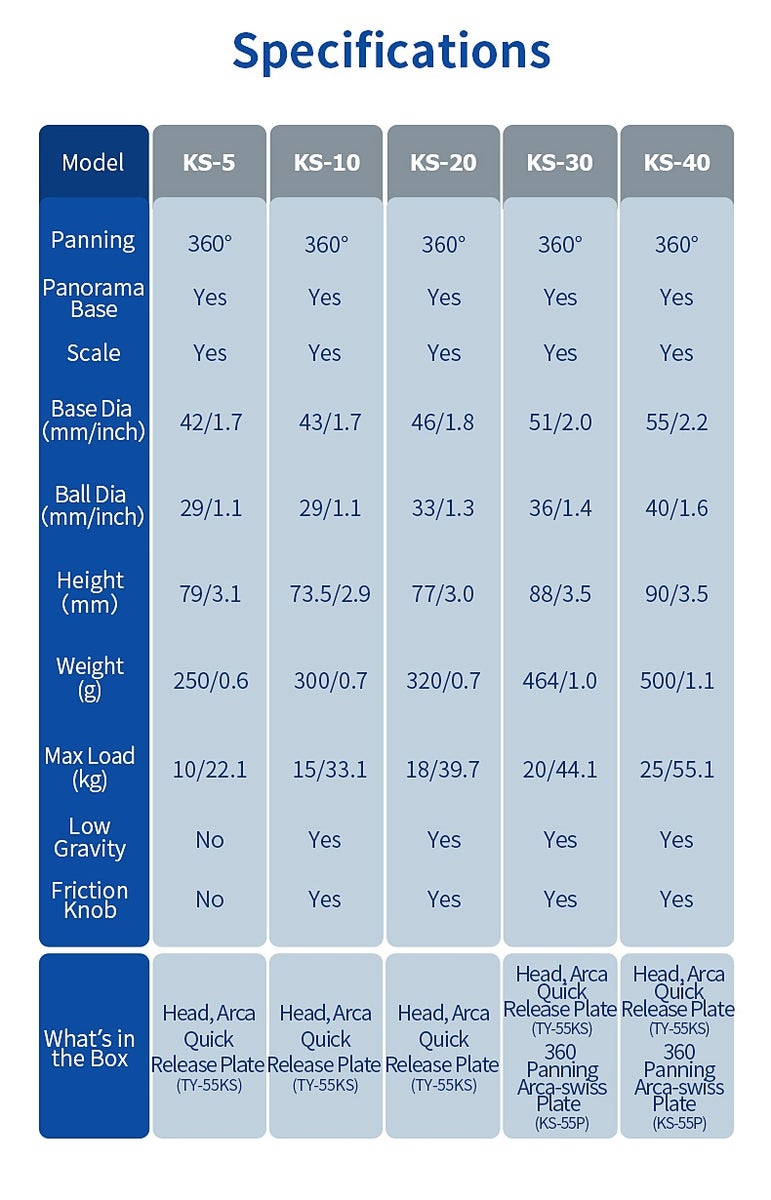 Kaikissa Sirui KS-sarjan viidessä kuulapäässä on mukana ARCA-standardin pikakiinnityslevy, joka täyttää monipuoliset kuvaustarpeet.