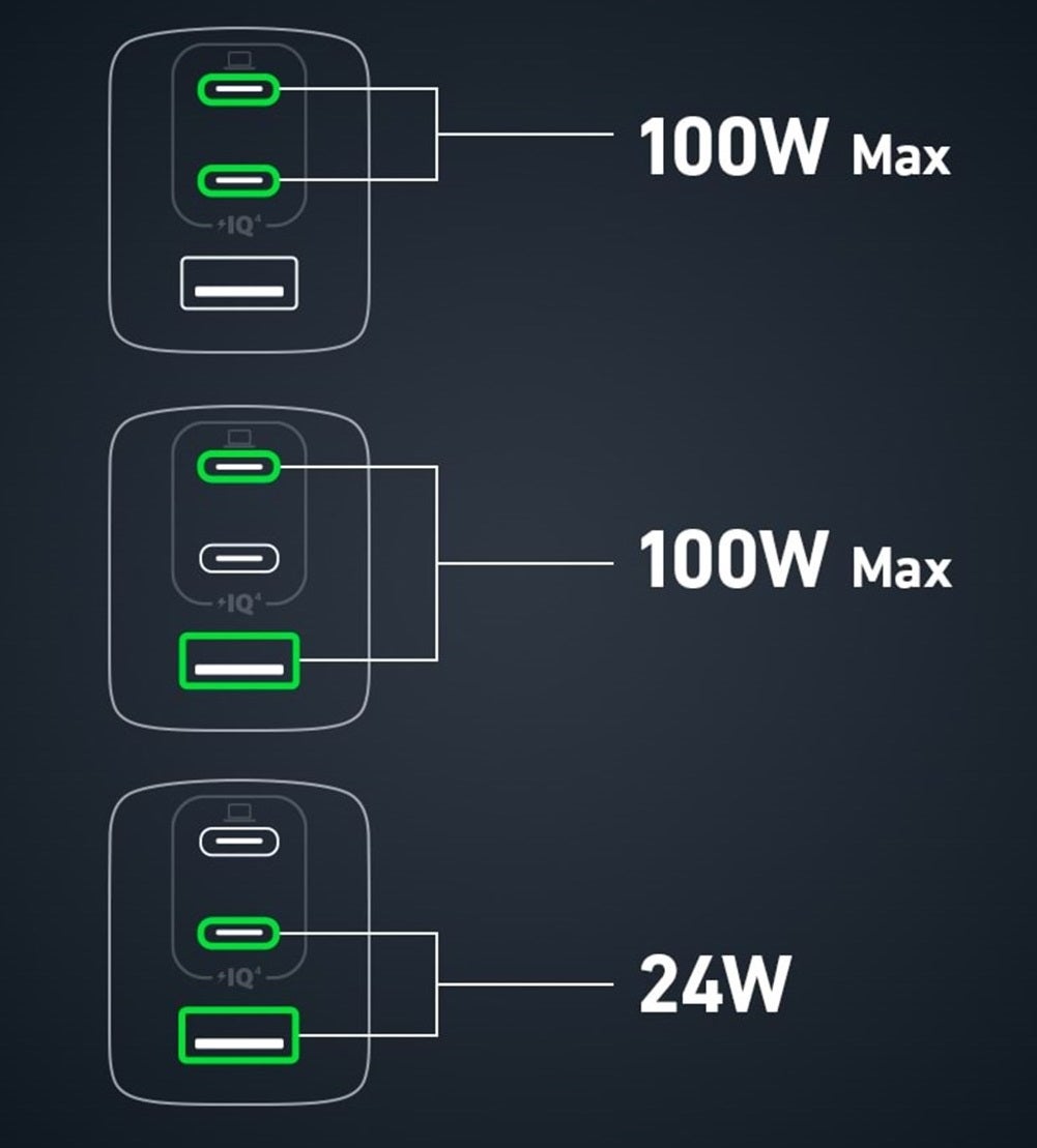 Anker 737 GaN Prime -laturi on varustettu kolmella latausportilla, kaksi USB-C- ja yksi USB-A-portti, joten tällä voimanpesällä lataat yhtä aikaa kolmea laitetta esim. puhelinta,kameraa ja kannettavaa tietokonetta.