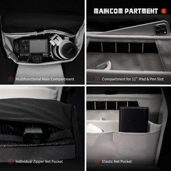 VSGO Black Snipe -kameralaukku 6L on tyylikkäästi muotoiltu, kestävä laukku jossa on fiksut suljentamekanismit. Laukun tilava, 6 litran päälokero muuntuu tarpeidesi mukaan: siihen mahtuu kamera, 2–3 objektiivia sekä pienempiä lisävarusteita. Säädettävät väliseinät, erillinen 11” iPad-lokero, kynäteline, vetoketjullinen verkkotasku ja joustava verkkolokero pitävät kaiken järjestyksessä.