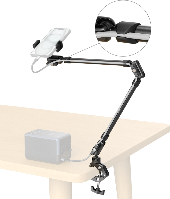 Rapupuristimen leuat avautuvat jopa 55 mm asti, ja sen silikonipehmusteet suojaavat pintoja. Se kiinnittyy sekä tasaisiin pintoihin että 15–44 mm halkaisijaltaan oleviin sylinterimäisiin kohteisiin, kuten pöydänreunoihin, tankoihin tai jalustoihin. Puhelinpidike sopii laitteille, joiden leveys on 60–95 mm.